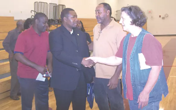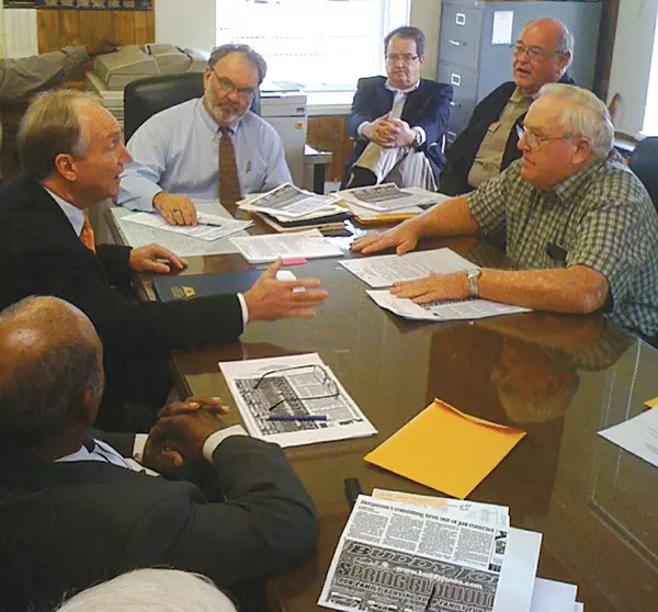 Carroll Montgomery Regional Correctional Facility consultant Ed Hargett of Corrections Management Services Inc., left, meets with Carroll County supervisors Monday to ask for a new contract with the county, which he says he was promised. Talking with Hargett are, from lower left, James Cobbins, Stanley "Sugar" Mullins, Alan Devoe Lancaster, Sheriff Jerry Carver and board president "Honey" Ashmore.