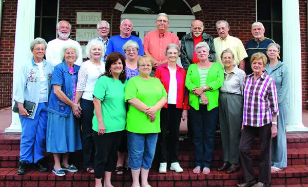 Some of Liberty Baptist Church's longtime members gather on the steps of the church. Front row, from left, are Rachel DuBard Hays, Nell Whitfield, Sandy Rogers, Brenda Tanner, Frances Costilow, Linda Narmour, Mary Lou DuBard, Janie Upchurch, Sarah Henderson, Judy Manelli and Lisa Gammill; back, from left, Lem Rogers, Gary Tanner, Gene Costilow, Alvin Upchurch, Paul Henderson, J.T. DuBard and James Narmour.
