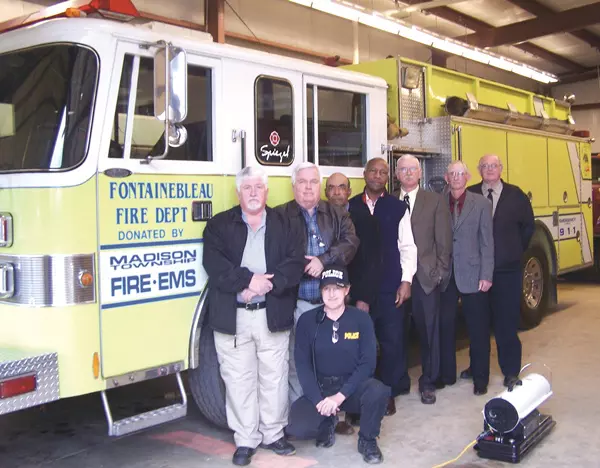 The Fontainbleau Fire Department has donated a fire truck worth about $150,000 to the Vaiden Fire Department. Fire Chief Ladonna Brooks, in front, shows off the truck to county officials, from left, Bobby Grantham, emergency management coordinator, Supervisors Rickie Corley and James Cobbins, Vaiden Mayor Melvin Hawthorne, Supervisors Terry Herbert and Marvin Coward, and Sheriff Jerry Carver.