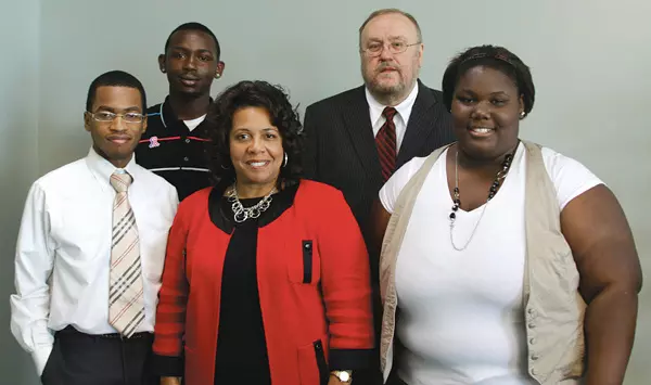Six members of the Mississippi Valley State University mock trial team won honors at the John Marshall Gulf Coast regional competition in Baton Rouge, La. Pictured, front row, from left, are Randall Johnson, MVSU President Donna Oliver and Arlinda Carter. Back row, from left, are Gianni Williams and team coach Larry Chappell.