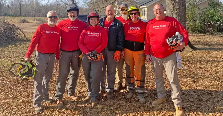 The volunteers from the Church of the Highlands divided into groups in order to clear yards for widows, single mothers, the elderly and folks with medical conditions. In this group are, from the left, Ronald Wyres, Todd and Chere Fulmer, Kerry Thach, Chris Pumphrey, Dusty Douglas and Josh Hillman, all from Birmingham. Hillman was the group’s leader.