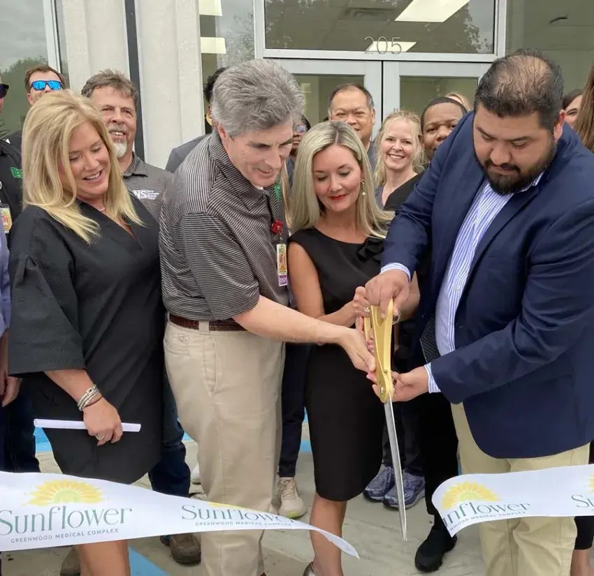 Cutting the ribbon for the Sunflower Greenwood Clinic are, from the left at the front, Stacy Davis, foundation director and events coordinator; COO Sam Miller; Brooks Rizzo, chief clinical officer; and CEO Daniel Ceja. (By Susan Montgomery, Copyright 2024 Emmerich Newspapers, Inc.)