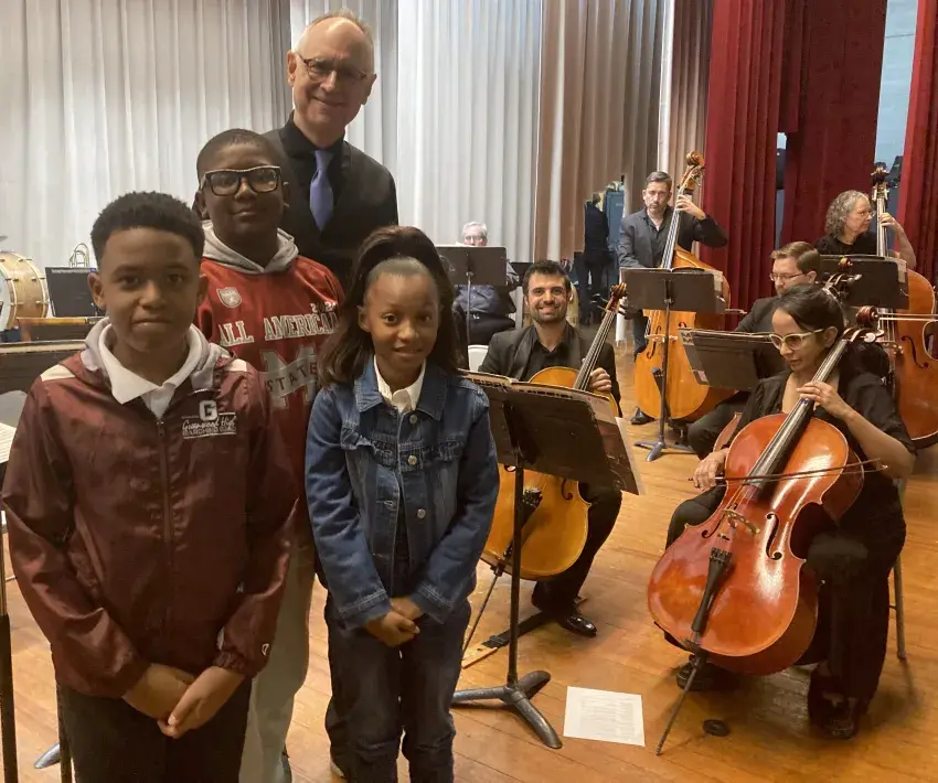 Davis Elementary School students join the Mississippi Symphony on stage before it performed Thursday in Greenwood High School’s auditorium. From the left are King Watson, grade 5; Jamison Jones, grade 6; conductor Crafton Beck; Adolyn Smith, grade 5; and, in the background, cellists Mert Ozkan and Veronica Parrales. (By Susan Montgomery, Copyright 2024 Emmerich Newspapers, Inc.)