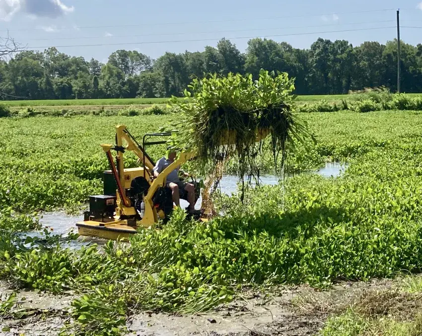 A company from West Palm Beach, Florida, demonstrates how water hyacinths covering Blue Lake at Berclair can be lifted from the surface and then mounded lakeside for drying and disposal. The hyacinths, which invade lakes and destroy water quality, are growing in lakes throughout Leflore County. They are rooted in water, not soil. Chemical applications also can be used to inhibit their growth. (By Susan Montgomery, Copyright 2024 Emmerich Newspapers, Inc.)