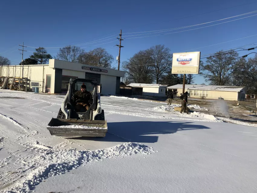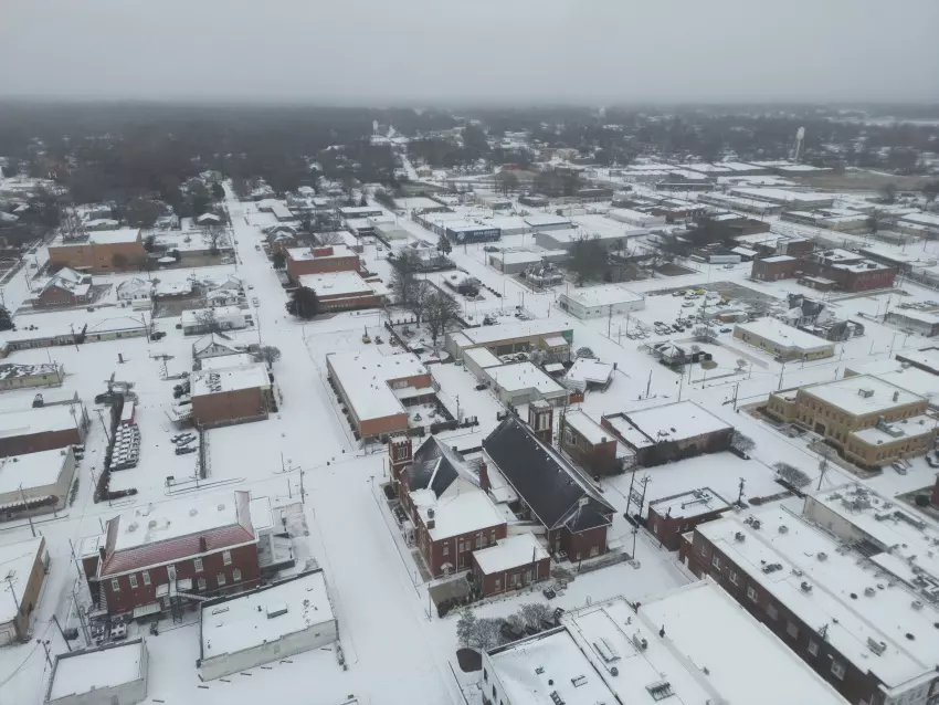 Henry Howard, 10, walks with his twin 8-year-old brothers, Mac and Witt (mostly hidden from view), across an icy Veterans Bridge near downtown Greenwood Monday morning as a light wintry mix continues to fall. (By Tim Kalich, Greenwood Commonwealth, Copyright 2024)