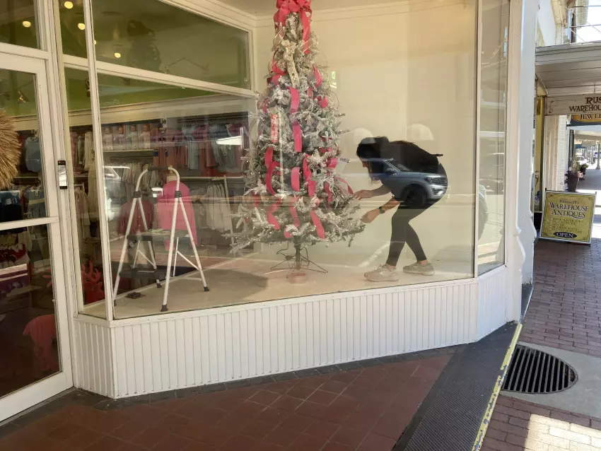Greenwood retailers have been preparing for the holiday season for months, and now it’s just around the corner. Store owners have been receiving merchandise and fixing up display windows in advance of the annual Holiday Open House from 5 until 8 p.m. Thursday on West Park Avenue and in downtown Greenwood. Santa has promised to visit downtown, and carriage rides are planned. Here, Greenwood artist Haley Farris is seen through a window at Sprout on Howard Street as she decorates a Christmas tree. (By Susan Montgomery)