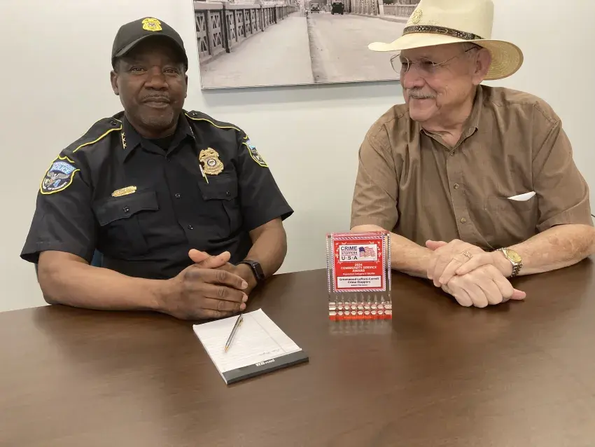Assistant Greenwood Police Chief Clifton King, left, and Jody Bradley, the Police Department’s executive administrator, have been working in the community to promote Greenwood Leflore-Carroll County Crime Stoppers’ system for getting anonymous tipsters to help prevent and solve crimes. Sitting next to them is the community service award that Crime Stoppers USA presented to the Greenwood-based Crime Stoppers last year. To provide a tip, call 1-800-222-TIPS (1-800-222-8477). (By Susan Montgomery, Copyright 2025 Emmerich Newspapers, Inc.)