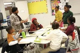 Likisha Coleman teaches reading during the holiday break for Greenwood Public Schools’ new Fast Track program. Students pictured from bottom left, clockwise around table are: Xavier Lucas, Myisha Kinds, Jamia Robinson, Kylan Townsend, Mahkiya Addison and Jazmine Glass. Photo by Taylor Kuykendall