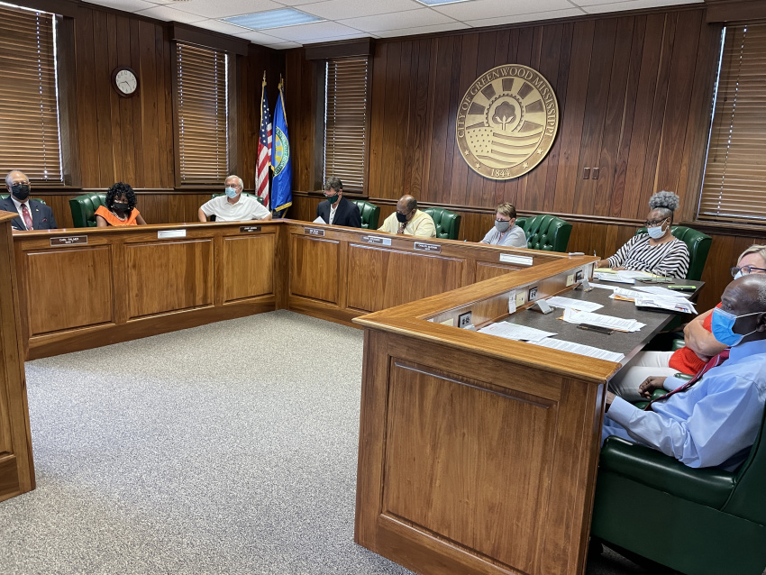 The Greenwood City Council discusses the budget for the upcoming fiscal year Tuesday. From left are Ward 7’s Carl Palmer, Ward 6’s Dorothy Glenn, Ward 1’s Johnny Jennings, City Attorney Don Brock Jr., Ward 3’s Ronnie Stevenson, Mayor Carolyn McAdams, Council Clerk Minnie Roby, Ward 2’s Lisa Cookston and Ward 5’s Andrew Powell. (By Drew Richardson)