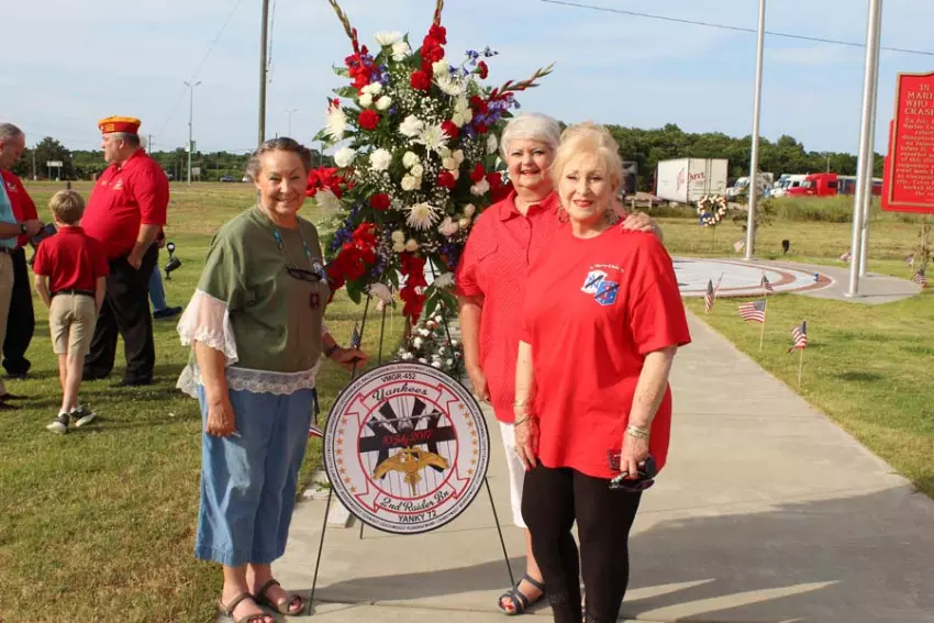 Brenda Grubb, left, and two other members of the Moorhead Garden Club — President Glinda Coats and Gail Oswalt —stand Saturday near a floral arrangement and plaque, which contains the names of the 16 servicemen who were aboard the fatal Yanky 72 flight in 2017. The garden club provided the floral arrangement for the memorial ceremony. (By Drew Richardson)