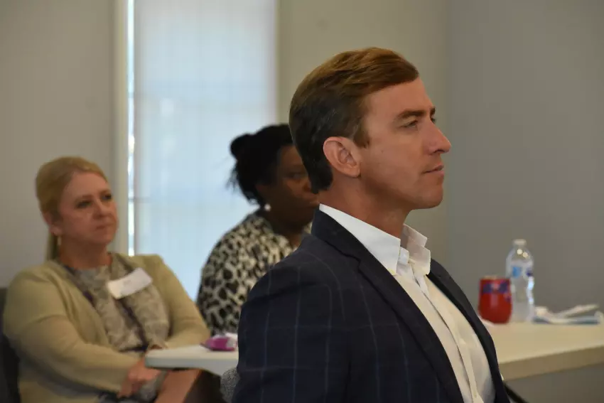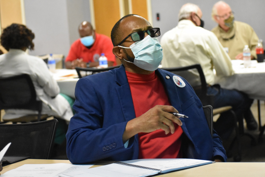 Reginald Moore, president of the Leflore County Supervisors, looks toward a screen showing information on the recent financial performance of Greenwood Leflore Hospital. Moore and other county and Greenwood officials met Tuesday, mostly in a closed-door session, with the hospital board and administrators to hear details on their plan to reverse the multimillion-dollar losses. (By Tim Kalich)