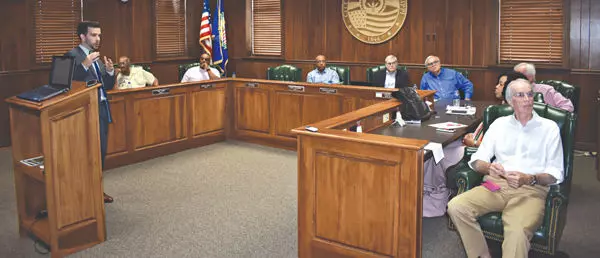 Members of a task force listen Friday to Ryan Sprinkle, near podium, part of a consulting team that is working on a strategic recommendation for Greenwood Leflore Hospital. Clockwise, from left, are Greenwood City Councilman David Jordan, Leflore County Supervisor Anjuan Brown, Dr. Roderick Givens, Dr. John F. Lucas III, Councilman Johnny Jennings, advertising executive Allan Hammons (partially hidden), hospital board member Emma Bell and hospital board Chairman Harris F. Powers Jr. Two other task force members, county Supervisor Reginald Moore and Larry Griggs, a former hospital board member, were unable to attend.