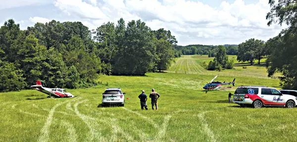 A single-engine plane, left, lies crushed in a grassy field near Vaiden, as authorities survey the scene of the non-fatal crash Thursday afternoon. In the center background is the private airstrip where the pilot, Walter J. Mitchell, was reportedly trying to land.