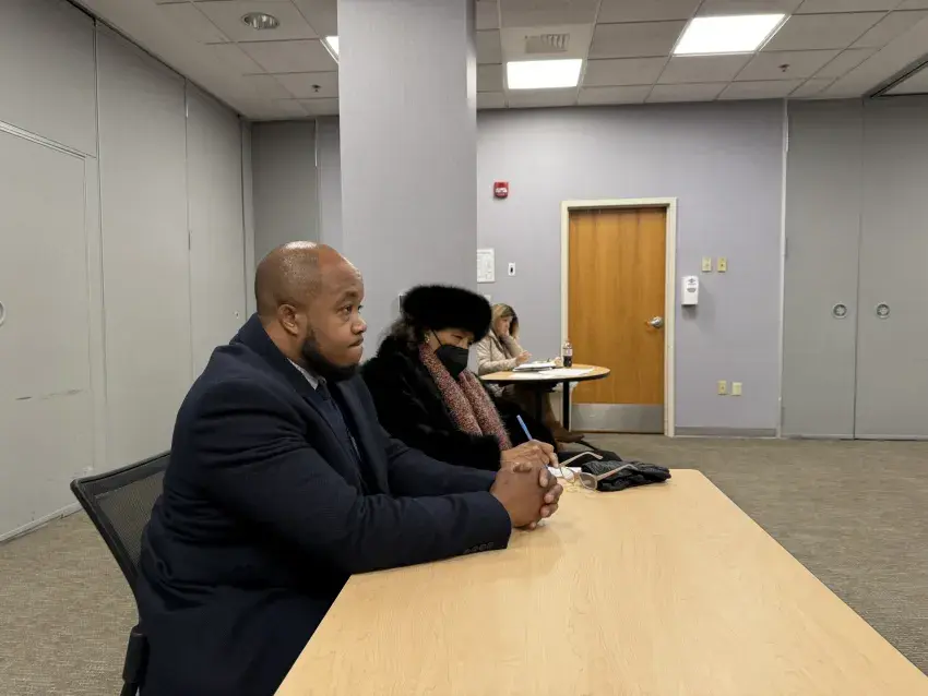 Dr. Margie Pulley, right, takes notes at the beginning of Tuesday’s meeting of the Greenwood Leflore Hospital Board. Accompanying her is one of her sons, Kelvin Pulley. Margie Pulley later addressed the hospital board behind closed doors, a possible violation by the hospital board of Mississippi’s Open Meetings Act. (By Tim Kalich, Copyright 2025 Emmerich Newspapers, Inc.)