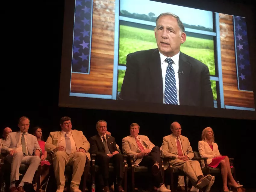 U.S. Sen. John Boozman of Arkansas delivers videotaped remarks during Friday’s 88th annual meeting of Delta Council in Cleveland. Boozman was scheduled to be the keynote speaker, but he was delayed in Washington to vote on the debt ceiling and budget deal. (By Tim Kalich)