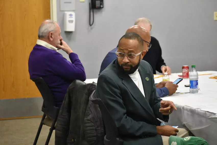 Leflore County Supervisor Reginald Moore looks back Tuesday to fellow Supervisor Robert Collins, off camera, at the start of the meeting of the Greenwood Leflore Hospital Board. Collins soon joined Moore at the table. In the background at left is Gary Marchand, the hospital’s interim CEO. (By Tim Kalich)