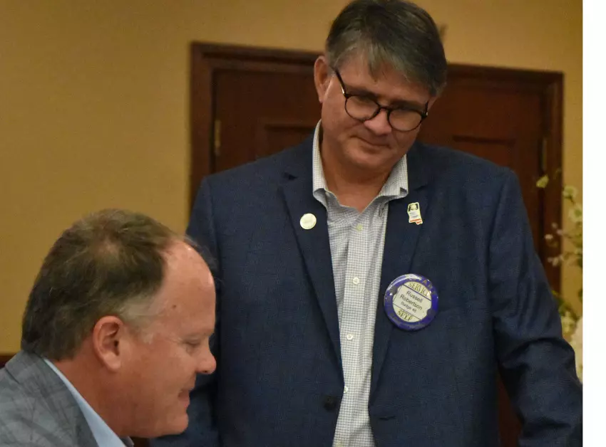 David Magee, left, signs copies of his book “Dear William” Tuesday after speaking to a pair of Greenwood civic clubs. Russell Robertson, right, the president-elect of the Greenwood Rotary Club, was so impressed by Magee’s message that he purchased copies for each of his three children. (By Tim Kalich)