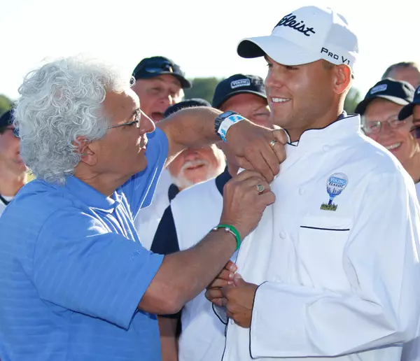 Joe Sherman, president of the Viking Cooking Schools, adjusts a chef's jacket on Bill Haas, winner of the Viking Classic golf tournament in Madison Sunday. Haas finished the day with a 72, winning by three strokes. Viking and its subsidiaries are the title sponsor of Mississipi's only regular PGA Tour event.