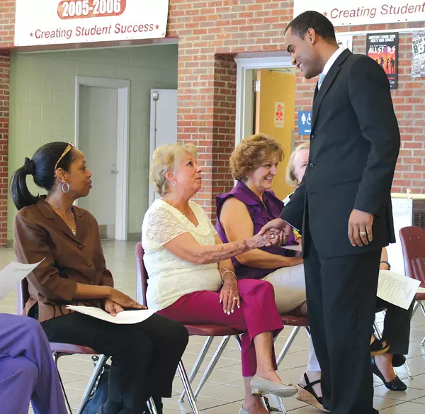 Dr. Montrell Greene, superintendent of the Greenwood School District, shakes hands with Sharon Ainsworth, a secretary at the central office who is retiring after 35 years with the district. Also pictured are, left, Gail Griggs, the band director at Greenwood High School who is retiring after 28 years of service for the district, and right, Mary Woods, a cafeteria manager at Davis Elementary who is retiring after 38 years.