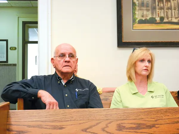 Bob Hunter, CEO of 4-Way Electric, a Greenwood-based electric company, sits with the company’s office manager, Ellen McKibben, during Monday’s meeting of the Leflore County Board of Supervisors. 4-Way Electric was granted a 10-year ad valorem tax exemption as it looks to expand its business in the county.