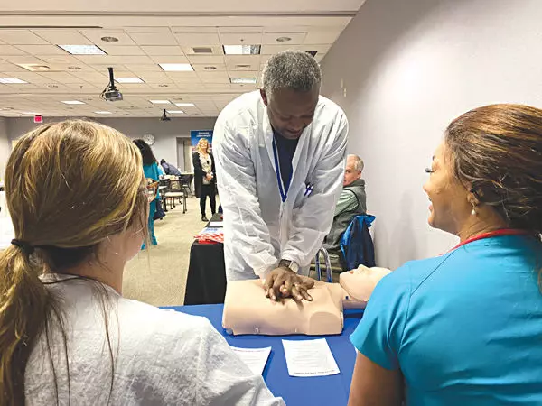 Clarence Hodges, center, a lab supervisor at Greenwood Leflore Hospital, practices CPR on a dummy while emergency room nurses Carter McNeer, left, and Victoria Fears instruct him on the proper technique on Thursday at the hospital’s heart health fair.
