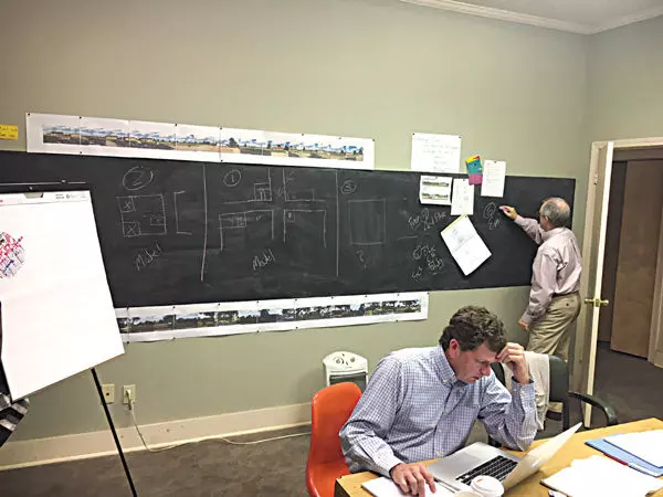Oliver Seabolt, seated, and Bob Barker of Orion Planning and Design look over schematics of unoccupied buildings in downtown Greenwood that have been assessed for potential development. Orion Planning and Design, a national city planning group, is helping determine what needs to be done to rehabilitate the buildings and what it would cost.