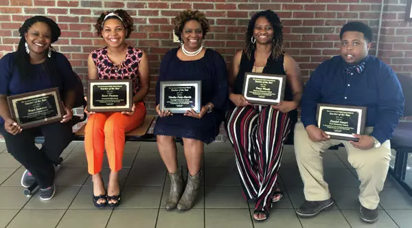 Greenwood Public School District honored its students, parents, classified employees, certified employees and teachers of the year at Thursday’s board meeting. From left are Teachers of the Year Traci Sanders of Greenwood Middle School, Torri Thomas of Greenwood High School, Tiketha Patty-Harris of Threadgill Elementary School, Tracy Woods of Bankston Elementary School and Daniel Smart of Davis Elementary School. Not pictured is Carol Love of the Career and Technical Center.
