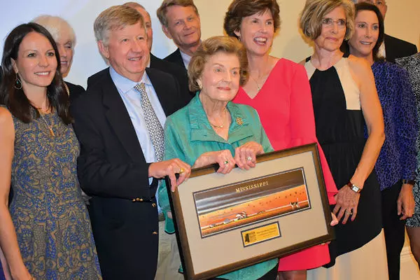 Ygondine Sturdivant, center, is surrounded by relatives after the matriarch and her family were recognized for philanthropy at Thursday’s annual fundraising gala for the Museum of the Mississippi Delta. Front row, from left, are Kathryn Dyksterhouse, Sykes Sturdivant, Mrs. Sturdivant, Ygondine Creasy, Jan Sturdivant and Lynn Sturdivant; back row, Lanie Sturdivant, Walker Sturdivant (partially hidden), Gaines Sturdivant and Mike Sturdivant III (partially hidden).