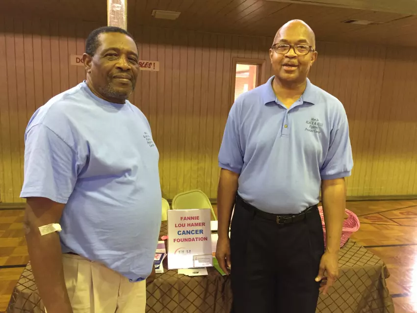 Oscar Mitchell, left, stands with Sammy Foster on Saturday during a health fair put on by Leflore County Community Health Advisors Men in Black and Blue Fighting Prostate Cancer. They said men have been attending the health fairs in good numbers. “It’s working because we’re making them aware and we’re educating them,” Foster said. For more information about the group, call Foster at 515-5860.