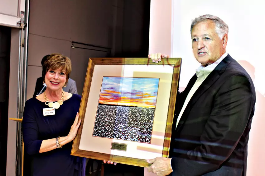 Cheryl Taylor, left, executive director of the Museum of the Mississippi Delta, presents framed artwork by Cameron Knight Watson, a former Greenwood resident, to Tommy Gary, chairman of the Greenwood Utilities Board of Commissioners, during the museum’s second annual benefit Thursday. Artwork was also presented to Bill Litton, president of Wade Inc.