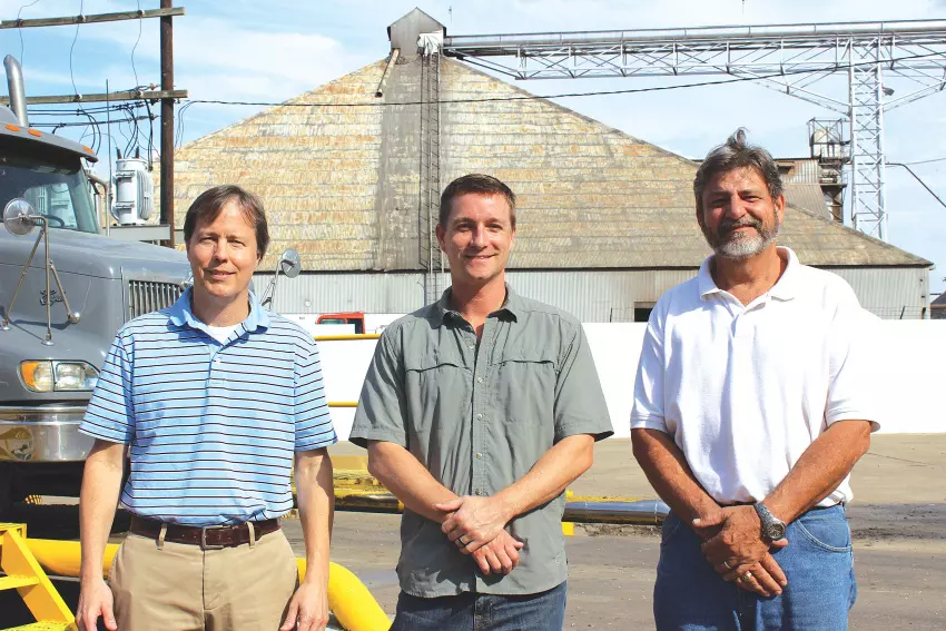 John Coleman, center, president of Express Grain Terminals LLC, is the new owner of Express Grain Oil Mill, formerly the Delta Oil Mill. The oil mill will be able to process both cotton and soybean seed, producing products for in-state catfish and poultry processors among others. With Coleman, from left, are John Stewart III, the oil mill’s commercial manager, and Lacy Lary, the mill’s general manager.
