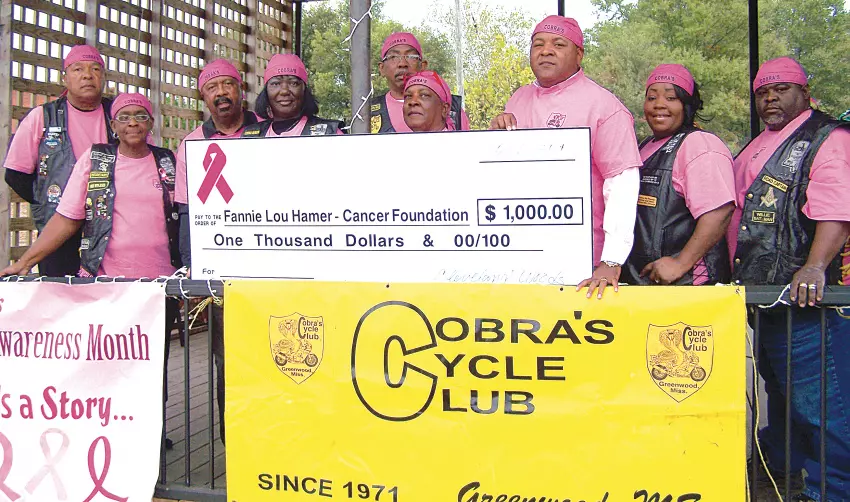 Greenwood’s Cobra Cycle Club is conducting a rally Saturday as part of National Breast Cancer Awareness Month. From left are Preston Ratliff, vice president; Corine Ward, secretary; Roosevelt Roach, club adviser; Helena Granderson, Cobra queen; Tracy Hansbrough, member; Fannie Gordon, member; Ronnie Stevenson, club adviser; Natarcia Robinson, member; and Willie “Batman” Marble, road captain.