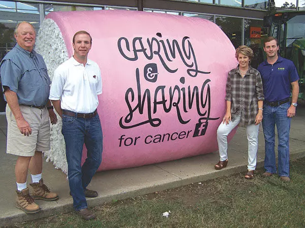 Wade Inc. is joining forces with Caring & Sharing for Cancer Foundation as part of National Breast Cancer Awareness Month. Four farmers, using the John Deere 9970 self-baling cotton picker, are wrapping their bales in pink, the color used to symbolize breast cancer awareness. Wade is matching all donations it receives for use by the foundation up to $5,000. From the left are Dale Pillow, a breast cancer survivor; Matthew Hicks, Wade’s general manager; Paula Provine, president of Caring & Sharing and a breast cancer survivor; and Wade Litton, chief operating officer of Wade Inc.