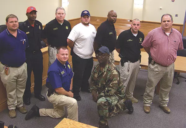 Members of the Leflore County Dive, Rescue and Recovery Team meet to discuss a planned fundraiser to be held at Greenwood Market Place June 28: kneeling, from left, Lt. Byron O’Bryant and Sgt. Melvin Cook of the Greenwood Police Department; second row, Leflore County volunteer firefighter William Tucker, Capt. Chris Glass of the Greenwood Fire Department, Leflore County Undersheriff Ken Spencer, Leflore County volunteer firefighter Banks Tucker, Leflore County Deputy Fred Randle, Leflore County Deputy Matthew Brown and Greenwood Detective Sgt. Toby Meredith.