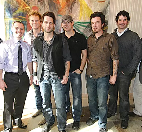The country-rock band Parmalee, which had a No. 1 hit in December on the Billboard Country Music Chart with its song “Carolina,” was signed in March by former Greenwood resident Jim Landers and his partner, Greg Gallo, who are managing partners of Gallo and Landers Music LLC of Nashville. From the left are Landers; Barry Knox, the band’s bassist; Matt Thomas, lead singer; Scott Thomas, drummer; Josh McSwain, lead guitarist; and Gallo.