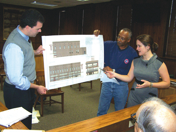 Thomas Gregory, left, the City of Greenwood’s chief administrative officer, and Victor Stokes, the city’s director of code enforcement, hold an architect’s drawing while Brantley Snipes, executive director of Main Street Greenwood, discusses the details of the proposed renovations of The Crystal Grill restaurant during Monday’s meeting of the Greenwood Historic Preservation Commission.