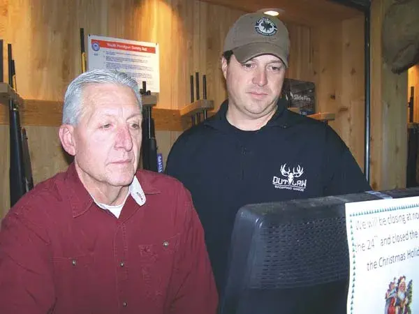 Ward Gilbert, right, manager of Outlaw Sporting Goods, said gun sales have been strong since the re-election of Barack Obama. The mass shooting in Newtown, Conn., a week ago only increased the demand as customers fear impending new federal gun controls. Gilbert is seen here with Randy Glover, the store’s gun sales manager, checking on gun orders.