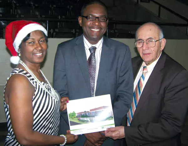 Freddie White-Johnson, left, founder and president of the Fannie Lou Hamer Cancer Foundation and Dr. Alfio Rausa, right, the foundation’s vice president, greet Michael L. Jones, the newest member of the foundation’s board, Thursday night. White-Johnson and Rausa are also displaying a drawing of the foundation’s planned headquarters building in Ruleville.