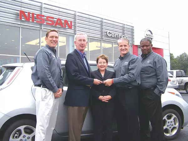 Mayor Carolyn McAdams, center, accepts the keys to an all-electric Nissan Leaf Tuesday. The vehicle, which is on a two-year lease to the Greenwood-Leflore-Carroll Economic Development Foundation, is being loaned to McAdams for official duties. From left are Lance Gregory, general manager of Cannon Nissan; Bill Crump, foundation chairman; McAdams; Michael Joe Cannon, owner of Cannon Nissan; and Tony Ellis, sales manager of Cannon Nissan.
