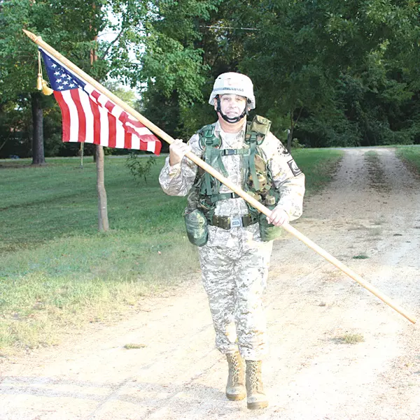 But unlike other runners, the Commonwealth advertising representative has been running in combat uniform with a helmet and a 35-pound pack, carrying an American flag on a pole.