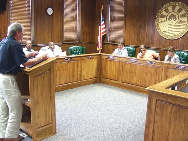 Sam Makamson, left, an insurance agent for the city of Greenwood health insurance plan, discusses the importance of maintaining a $500,000 reserve fund with members of the City Council Tuesday during a 2013 budget workshop. Listening from the left are Ward 7’s Carl Palmer, Ward 6’s David Jordan, City Clerk Nick Joseph, City Council President Ronnie Stevenson and Greenwood Mayor Carolyn McAdams.