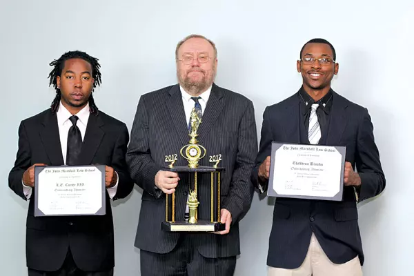 Mississippi Valley State University graduating seniors L.E. Carter III, left, and Thaddeus Brooks, right, members of Valley’s mock trial team, took home law school scholarships from the John Marshall University Diversity Mock Trial Competition held in Chicago. Both Carter and Brooks received $2,000 scholarships as Outstanding Trial Advocates Award winners. Brooks’ team finished second in the national championship round. For his second-place win, Brooks received an additional $9,000 law school scholarship. Holding Brooks’ second-place trophy is Larry Chappell, Valley’s pre-law adviser and professor of political science.