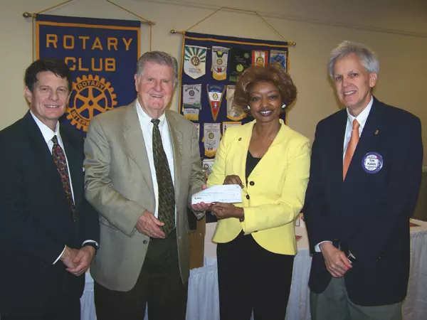 Jean Cadney, second from right, president of the Greenwood Rotary Club, presents a check Monday for $4,000 to Victor Smith, founder of Clean Water for Malawi, a Jackson-based charity that seeks to build 150 water wells a year in the African country. On hand for the donation are Wyatt Emmerich, far left, publisher of The Northside Sun and president of Emmerich Newspapers Inc.; and Tim Kalich, editor and publisher of The Greenwood Commonwealth.