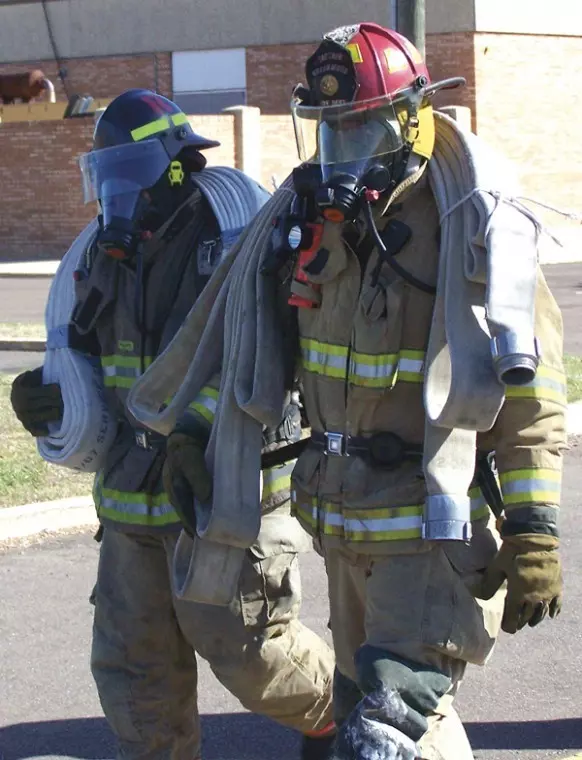 During the test at Fire Station No. 4, three-man teams carried sections of hose, which alone weighed 50 pounds, in addition to full gear and an operational air pack.