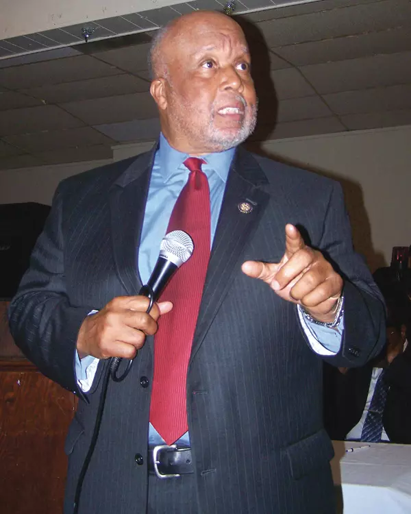 Visitors Bureau, foreground, claps at the unveiling of the Walter