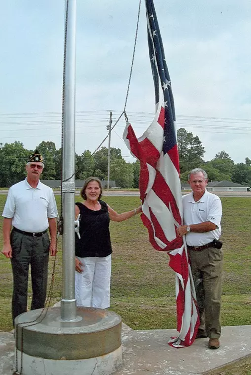 American Legion Post 29 recently donated an American flag to Life Help Industries. The flag, which once flew at the Bank of Commerce, was refurbished with the help of Adam Gnemi and now flies proudly once more. Post 29 1st Vice Commander Richard Avant, left, watches as Sheila Dickard, Life Help Industries coordinator, center, and Bank of Commerce’s Steve Lary, a Post 29 member, prepare to raise the flag.
