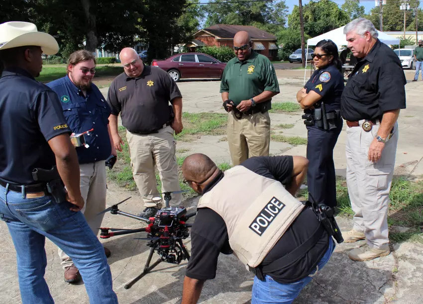 Representatives of several law enforcement agencies got a demonstration of aerial drone technology Tuesday in Tchula. The demonstration was put on by Delta Southern UAS LLC. Here, officials examine a DJIS 900 drone, which is equipped with high-resolution and infrared cameras. Kneeling is Robert Hooker Jr. of the Tchula Police Department; standing, clockwise from left, are Tchula Police Chief Kenneth Hampton, Delta Southern Chief Technical Officer Preston White, Leflore County Sheriff's Department Investigator Bill Staten, Sunflower County Sheriff James Haywood, Indianola Police Officer Regina Simpson and Leflore County Sheriff Ricky Banks.