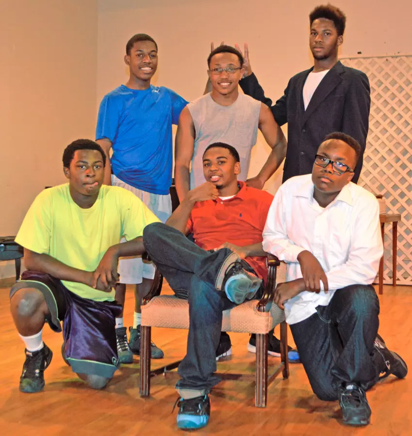 Delta Streets Academy students pictured during a rehearsal of Shakespeare’s “Twelfth Night” are, front row, from left, Jakarrian Hemphill (Valentine), Stephen Metcalf (Orsino) and Isaiah Blackmon (Curio); back row, Daree Robinson (Sir Toby Belch), Jaylin Smith (Viola) and Andre Williams (Sir Andrew Aguecheek.)