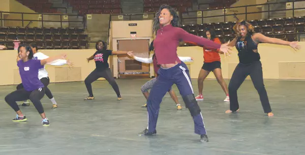 Virtuous Divine senior squad members, from left, Jasmine Carter, Alexia Davis, Nykiaya Nixon (partially obscured), Teunna Strong, Shandreika Flowers, Aiyana Anderson (obscured), Kaitlyn Hammond and Kamia Smith practice a dance routine for the second annual Virtuous Divine “Buck Wild” competition on Saturday at the Leflore County Civic Center.