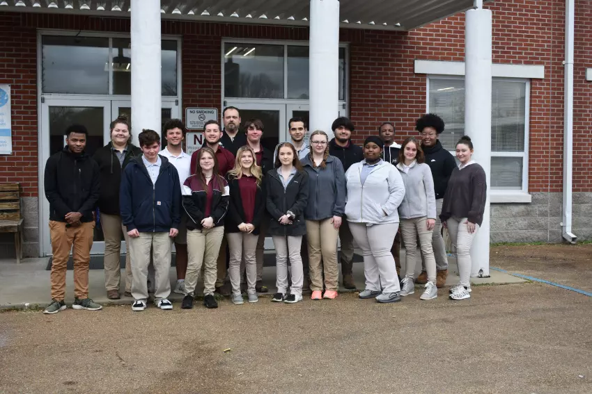 J.Z. George High School carpentry students participating in the upcoming state SkillsUSA competition include, front row, from left, Austin Little, Mandi Rone, Annabella Hokett, Mackenzie Mims, Lanena Johnson, Nae’Yuna Hardon, Angel Chenault and Kelsey Rowe; back row, Frediland Howard, Chritin Renea Bankston, Colten Brashear, Kevin Favela, teacher Jeff Fulgham, Mason Jenkins, Austin Leslie, Ivan Martinez, Jordun Normal and Lindsay Weeks. Not pictured are Brandon Myers and Terry Malone. (By Ruthie Robison)